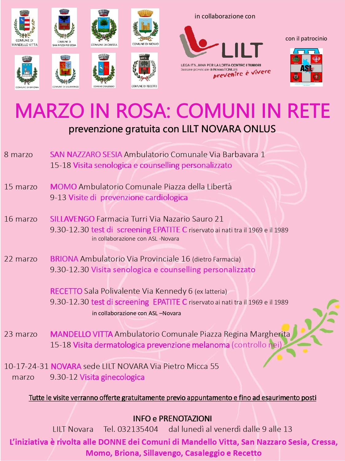 Tra queste, l'iniziativa "Marzo in Rosa-Comuni in Rete" vede appunto la collaborazione di Lilt Novara Onlus e dei Comuni di Mandello Vitta, San Nazzaro Sesia, Cressa, Momo, Briona, Sillavengo, Casaleggio Novara e Recetto, con il patrocinio di ASL NO.