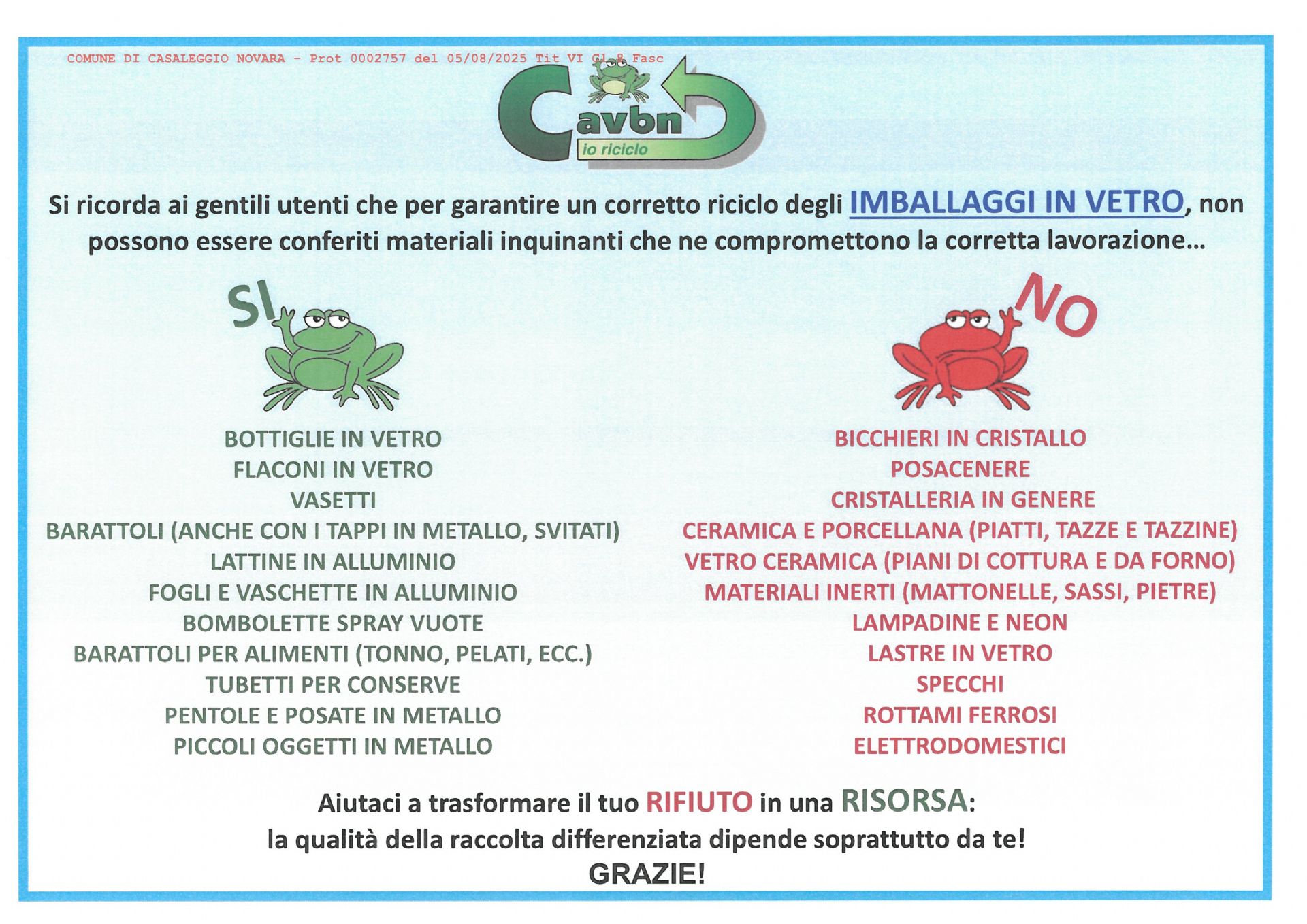 Il Consorzio Area Vasta Basso Novarese ha comunicato, con nota prot. 614, che la ditta Tecno Recuperi che si occupa della lavorazione e riciclo degli imballaggi in vetro raccolti sul territorio, lamenta da diverso tempo la presenza di materiali altamente inquinanti che ne pregiudicano l'avvio a riciclo, quali: