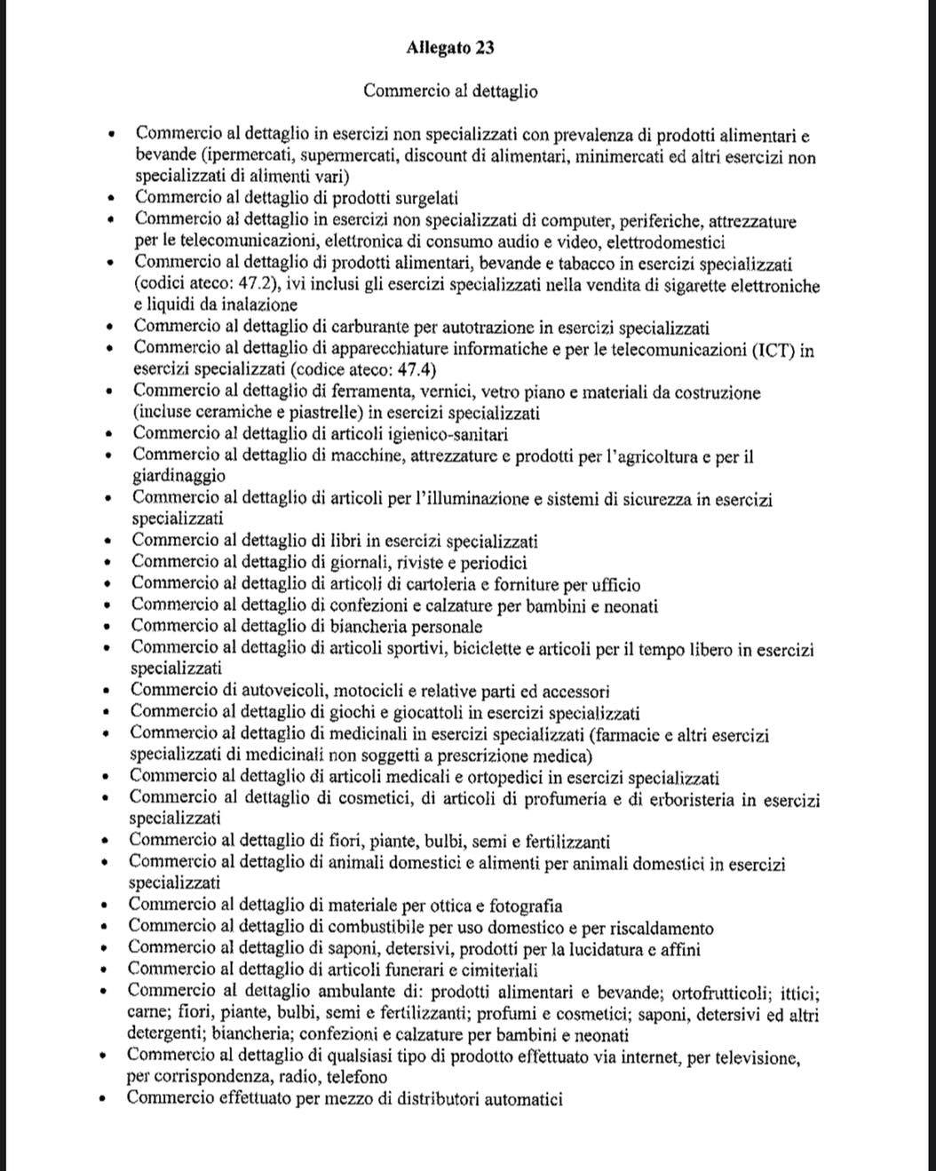 Sono chiusi i negozi a eccezione di alcune categorie: tra gli altri, alimentari, edicole, tabaccai, farmacie, parafarmacie, negozi per bambini e neonati, fiorai, negozi di biancheria, negozi di giocattoli, librerie, cartolerie, negozi di prodotti informatici, articoli sportivi, calzature, ottici, negozi di ferramenta, lavanderie, profumerie, e/o altre tipologie di negozi come specificato negli allegati 23 e 24 al DPCM.