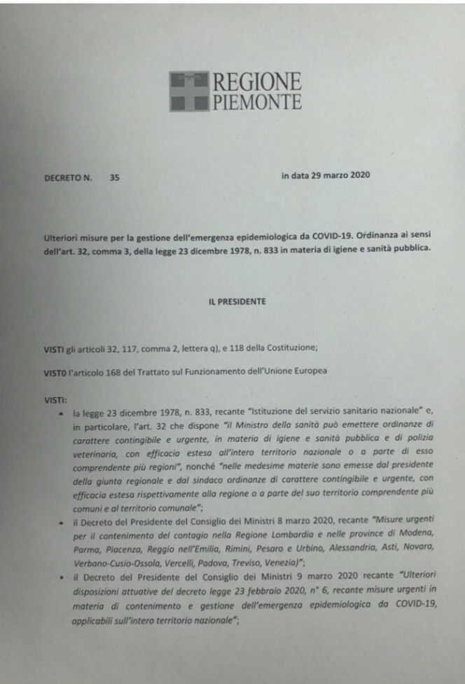 Decreto del Presidente della Regione Piemonte n. 35 del 29.03.2020 "Ulteriori misure per la gestione dell'emergenza epidemiologica da COVID-19 - Ordinanza ai sensi dell'Art. 32, comma 3 , della Legge 23 dicembre 1978, n. 833 in materia di igiene e sanità pubblica".