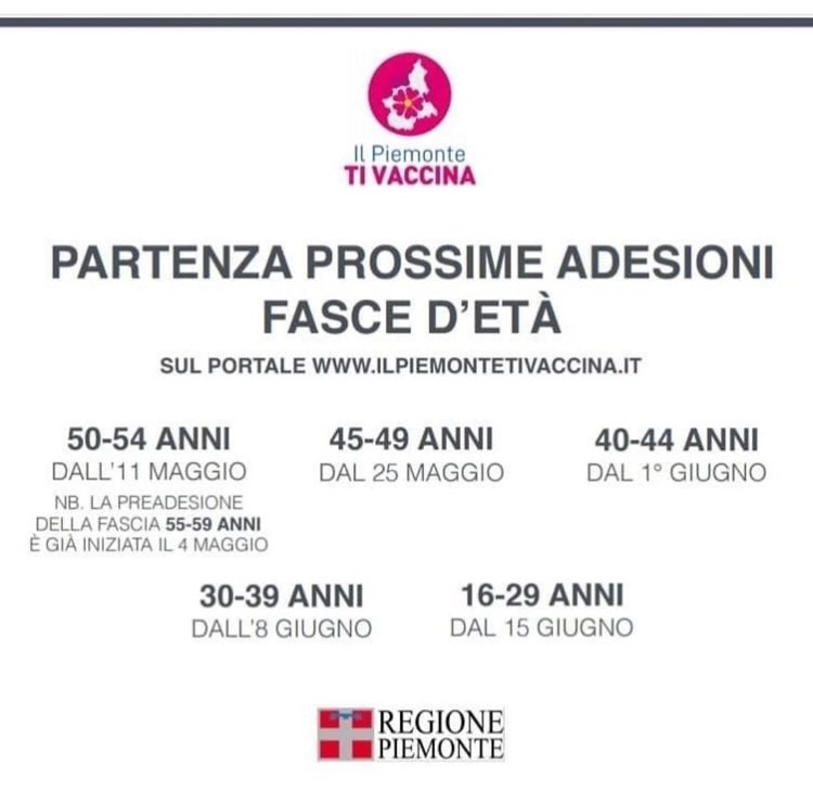 - da domani 11 maggio partirà sul portale IlPiemontetivaccina l‘adesione della fascia 50-54 anni (la fascia 55-59 anni può già aderire dal 4 maggio),