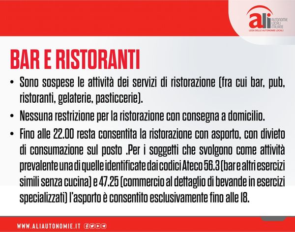 ☕️ CHIUSI BAR E RISTORANTI, CONSENTITI ASPORTO E CONSEGNE A DOMICILIO: