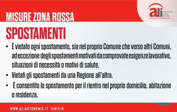 È vietato ogni spostamento anche all’interno del proprio Comune, in qualsiasi orario, salvo che per motivi di lavoro, necessità e salute. È consentito il rientro presso il proprio domicilio, abitazione o residenza. Non sono consentite visite a parenti e amici. Ci si potrà recare in abitazioni diverse dalla propria solo per lavoro, necessità e salute.