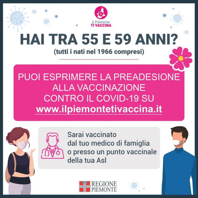 Sul portale www.ilpiemontetivaccina.it inizieranno da dmani martedì 4 maggio le preadesioni alla vaccinazione anticovid per i piemontesi di età compresa tra i 55 e i 59 anni.
