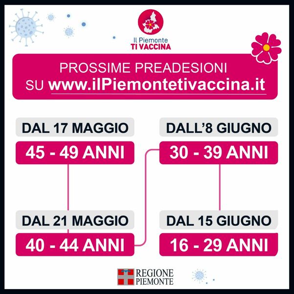 Da lunedì 17 maggio, in particolare, potrà aderire sul portale www.IlPiemontetivaccina.it la fascia 45-49 anni e da venerdì 21 maggio la fascia 40-44 anni.